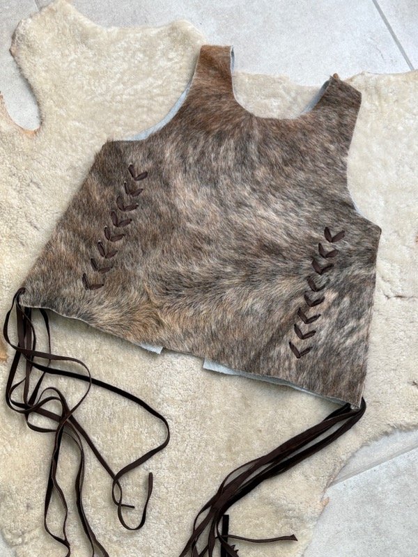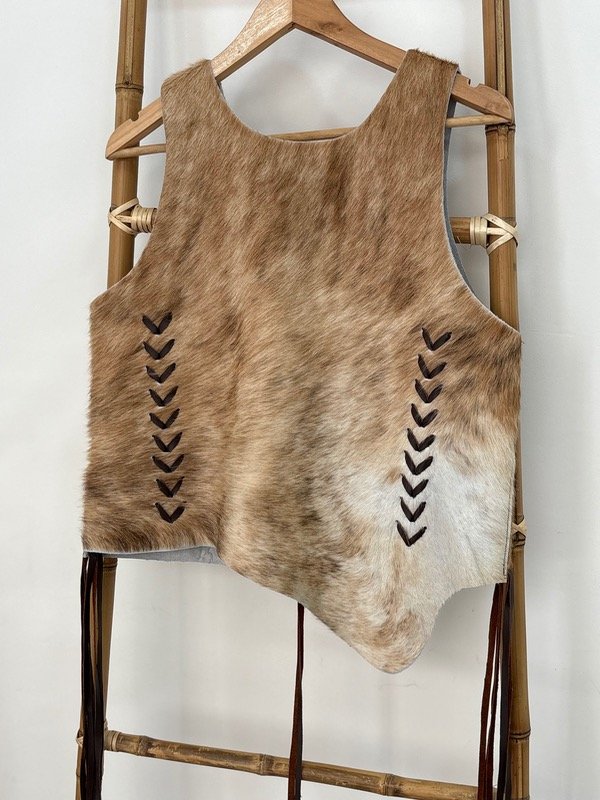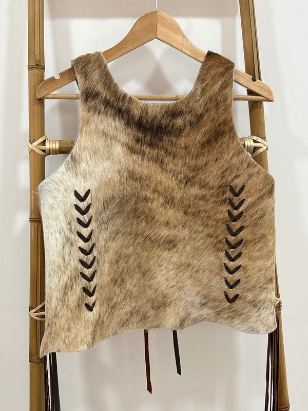 Chaleco de pelo vacuno con detalles y flecos en cuero rústico. Puede usarse como top y como chaleco